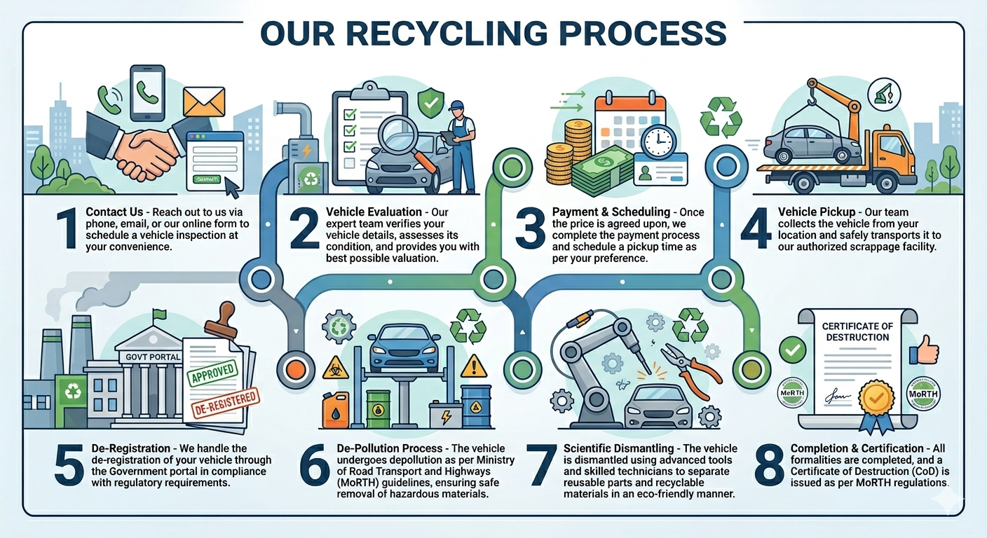 At Bengal Recycling Hub, we follow a safe, transparent, and government-compliant process to dismantle and recycle vehicles responsibly. Our step-by-step procedure ensures proper documentation, environmental safety, and legal compliance.